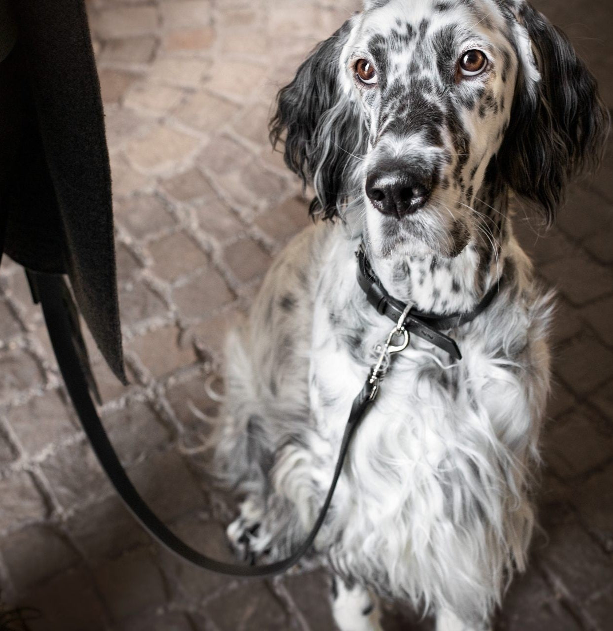 bold black italian leather dog collar with gleaming metal hardware on a dark background