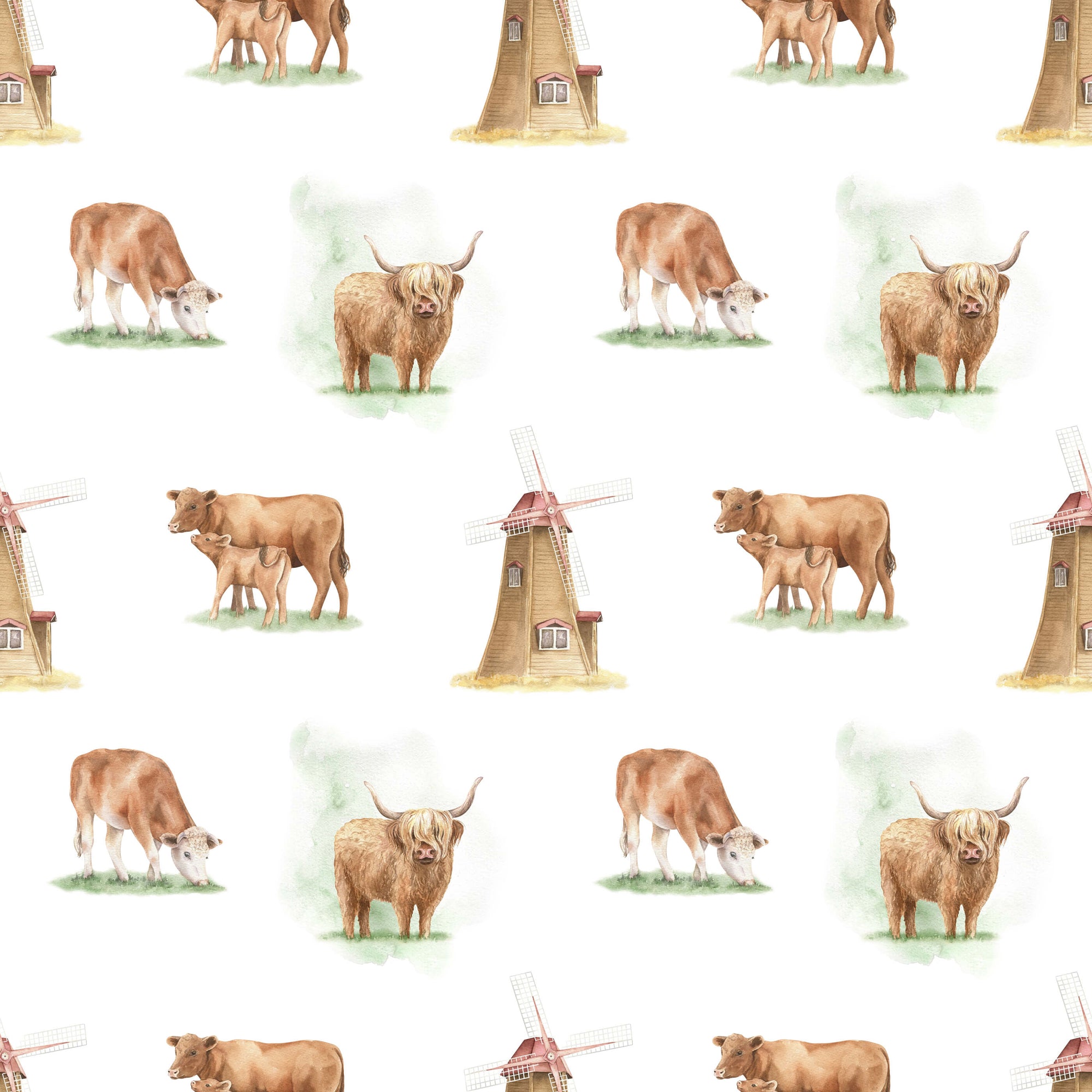Brown Highland Cow Wallpaper with Vintage Windmills